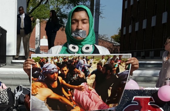 The SJP members expressed their solidarity with Palestinians who lost their lives in recent weeks due to the conflict. Their mouths were duct-taped shut, as they stood in rows with pictures of Palestinian victims and signs explaining the violence.