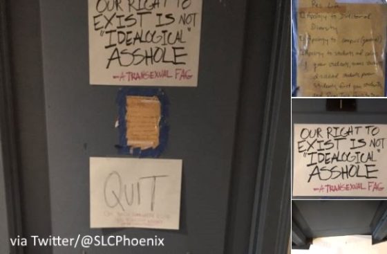 One of the signs on Abrams’ door reads “OUR RIGHT TO EXIST IS NOT ‘IDEOLOGICAL’ ASSHOLE” [sic] and was signed “A TRANSEXUAL FAG”. The one below it was a to-do list of apologies, which included the Directors of Diversity and Res life, respectively, several minority groups, and “campus (general).” Below the list of demanded apologies is a sign reading “QUIT,” and in smaller text, “go teach somewhere else, you racist asshat (maybe Charlottesville?).” Below that sign is one simply reading “QUIT,” and several pieces of paper urging Abrams to “QUIT” are spread out at the foot of the door. …