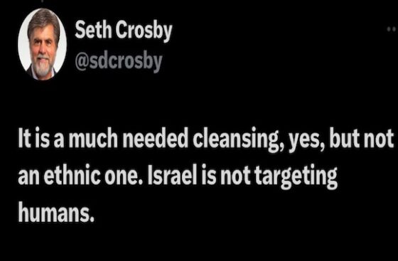 Seth Crosby, the director of research collaborations for the department of genetics, responded on X (Twitter) to E. Michael Jones’s comment “Israel is engaged in the ethnic cleansing of Palestinians” that “It is a much needed cleansing, yes, but not an ethnic one. Israel is not targeting humans.”