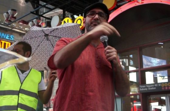 He encourages passers-by to join the anti-Israel boycott, divestment and sanction movement and emphasizes that the movement is not anti-Semitic, pointing to Jewish “brothers” and “sisters” who are “decoupling Judaism from Zionism.”