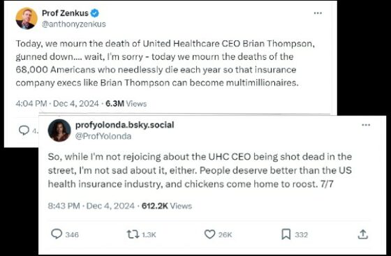 “Today, we mourn the death of United Healthcare CEO Brian Thompson, gunned down…. wait, I’m sorry – today we mourn the deaths of the 68,000 Americans who needlessly die each year so that insurance company execs like Brian Thompson can become multimillionaires,” the social work studies professor wrote.