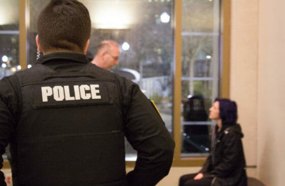 Scuffle in the back and a person was taken into the lobby by Portland State police. #JamesDamorePSU pic.twitter.com/pIiVG9oIMT