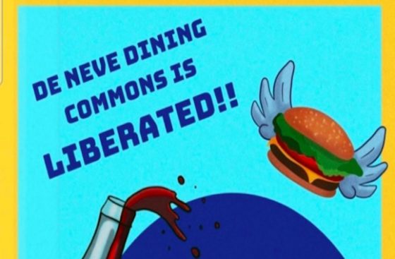 The Twitter account “Cops Off Campus UC” posted about the demonstrations on December 7 saying “Students should not be debt burdened, rent burdened or food insecure.” The post included images stating “Liberated Dining Hall — Fuck the UC” (pictured) and “De Neve Dining Commons is Liberated!!”