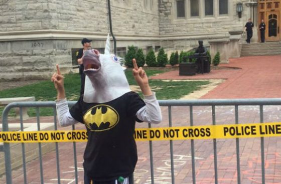 On the other side of Sample Gates, a young boy in a unicorn mask stood on the makeshift fence and raised his middle fingers to police. The yellow Batman logo on his black shirt matched the POLICE LINE: DO NOT CROSS tape behind him.