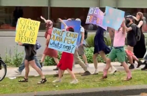 Many wore masks over their faces and some carried transgender flags and signs, such as “Olivia jarks to Jaseus” and “God is a dyke.”