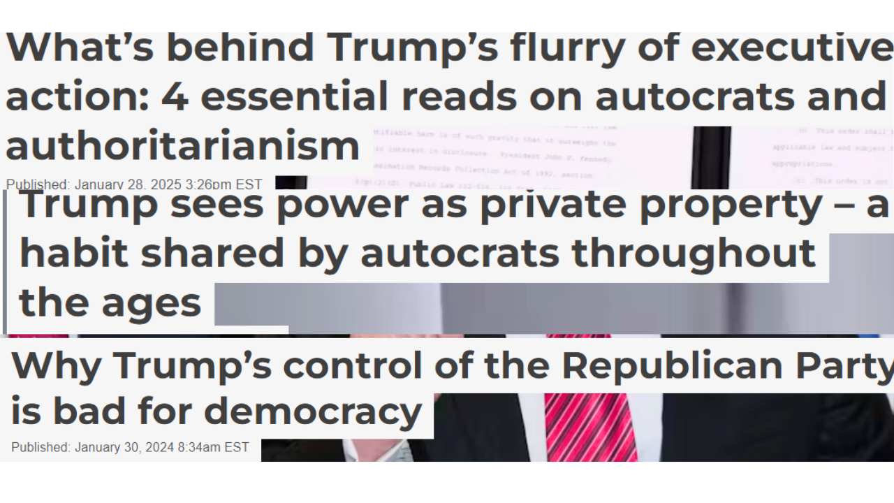 “The Conversation U.S. has published several articles – many from Donald Trump’s first term as president – that spell out how autocrats, and those who want to be autocrats, behave and why,” Editor Jeff Inglis wrote, along with comments from six professors. The website does regularly run articles that compare Trump’s actions to authoritarianism.