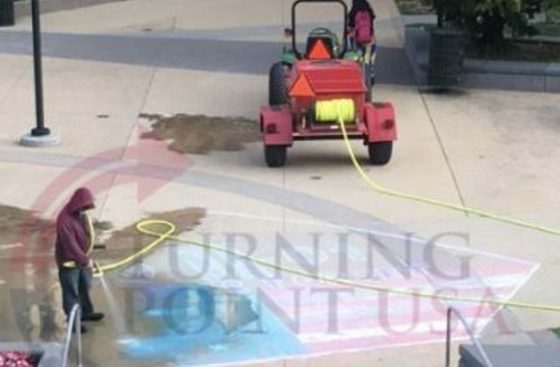 However, the artistic memorial didn’t last long. Hours after it was created, the university removed it. An image tweeted by Charlie Kirk, founder of Turning Point USA, shows a maintenance employee washing away the memorial with a power washer this morning.