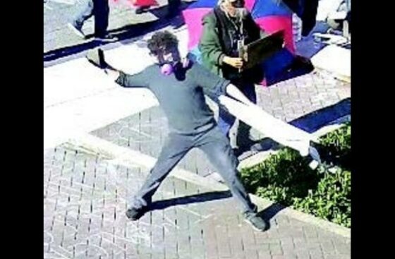 IMAGE CAPTION AND CREDIT: A suspect, identified by the U.S. Attorney’s Office as Reed College alumnus Robert Jacob Hoopes, 24, of Portland, allegedly throws a rock at an ICE building; U.S. Attorney’s Office for the District of Oregon