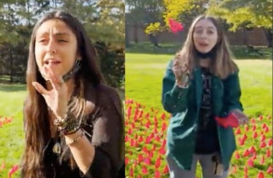 But two (and we want to be fair, here) what-appear-to-be female-identifying students were caught on video trampling on, and pulling out, many of the flags.