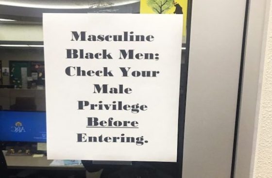 The American River Current, the student newspaper of American River College, reports that, earlier this month, someone posted a sign in the door of an office at the university student center reading: “Masculine black men; check your male privilege before entering.” The sign, posted in the door of the campus group UNITE, “was posted without explanation,” The Current reports.