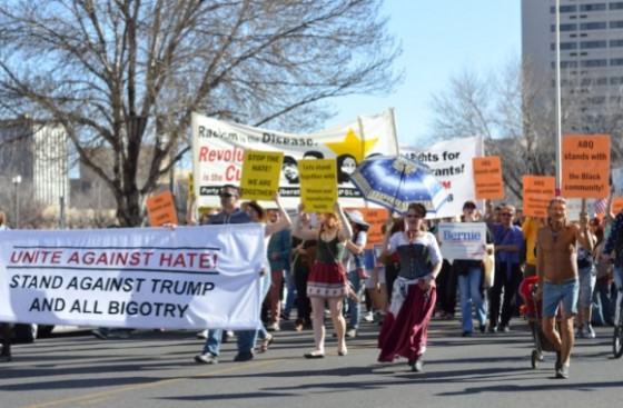 ALBUQUERQUE, N.M. – More than 200 activists crowded the Albuquerque Civic Plaza on Sunday afternoon to rally “against Trump and all bigotry” – a demonstration that brought together a wide assortment of college students and left-liberal activism groups in a call to “dump Trump” the day after the Republican presidential contender won the South Carolina primary.