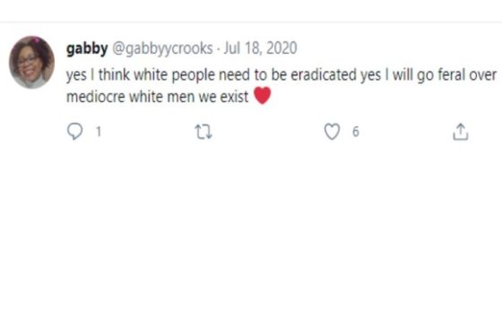 “Yes I think white people need to be eradicated yes I will go feral over mediocre white men we exist,” she wrote in July 2020.