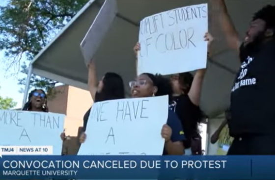 Holding signs and chanting, student protesters stormed the stage at the convocation while parents and students sat in the audience and watched, TMJ4 reported:
