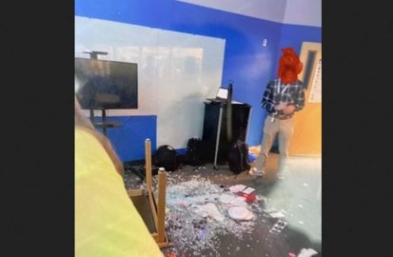 The TPUSA meeting had to end prematurely as the situation “grew heated,” which included a protester flipping over and destroying that glass table (pictured). A district spokesperson said the table incident was a “poor decision of an individual as the meeting was wrapping up,” and was not “part of a protest plan.”