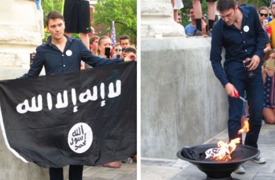 Ian Paris lights the handmade ISIS flag on fire. A crowd of about 150 chants “USA.” pic.twitter.com/Wl2vZlcpE7