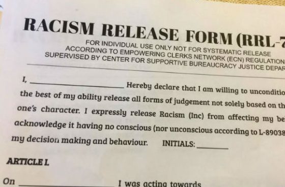 She is revising the Racism Release Form based on “feedback from students of color.” (The forms are licensed under Creative Commons, meaning they can be modified and shared noncommercially.)