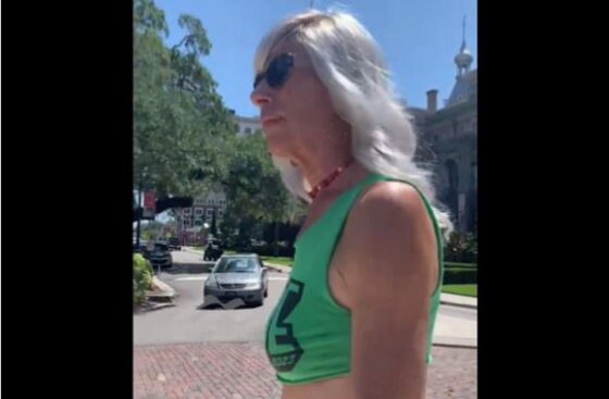 The man is shown dressed as a woman in pink daisy duke shorts, a neon green crop top, hot pink Converse shoes and a white-haired wig. He used a women’s bathroom in the University of Tampa’s Plant Hall, Gillis said.