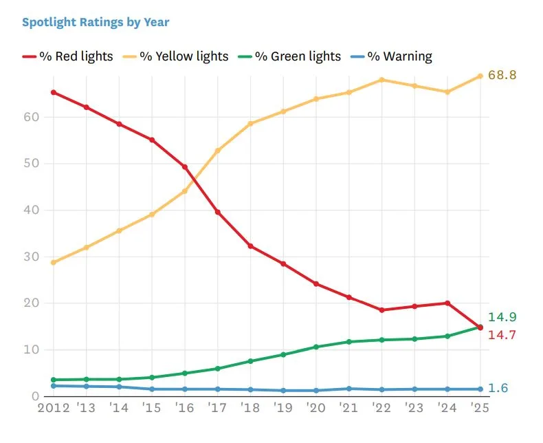 “For the first time in the history of this report, the number of schools that earned an overall green light rating was greater than the number of schools that earned an overall red light rating. This positive milestone marks a stark reversal of a concerning multi-year trend we highlighted last year,” the organization reported in its 2025 report.