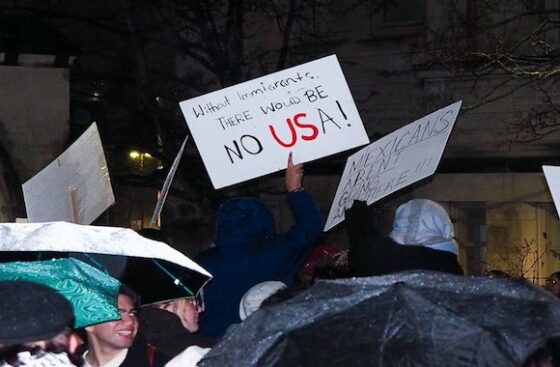 Slogans on activists’ signs read “My immigrant parents work harder than your president!!” “Mexicans aren’t going anywhere,” and “Without immigrants there would be no USA!”