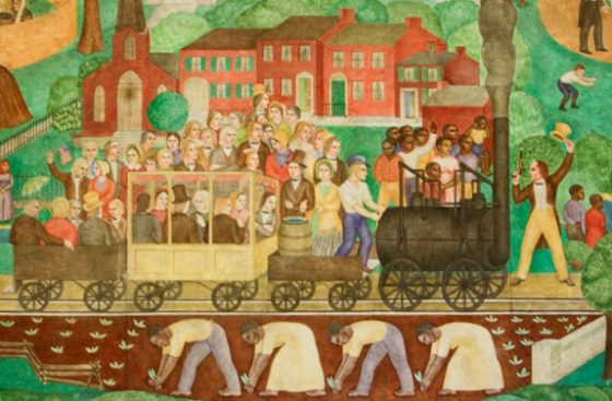 The mural (pictured) is meant to show the history of the state, with its different levels representing waves of progress, according to the guide. O’Hanlon painted several black slaves picking cotton, other black figures apparently segregated from whites and additional black people playing music for white people.