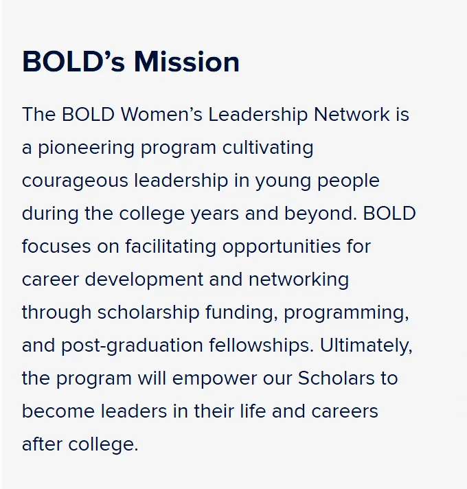 “BOLD focuses on facilitating opportunities for women’s career development and networking through scholarship funding, programming, and post-graduation fellowships,” the description previously stated.
