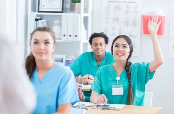 IMAGE CAPTION AND CREDIT: Medical student raises hand during class; SDI Productions/Canva Pro