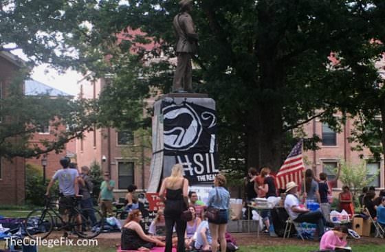 That protest launched Aug. 22 with a rowdy demonstration of hundreds calling for Sam’s shuttering. Since then, a small but steady group has maintained a vigil around the monument. The effort unfolded as school resumed classes for the fall semester. A few students event spent the night and braved a little rain to continue the vigil, complaining in Twitter that they were “denied tents by university.”