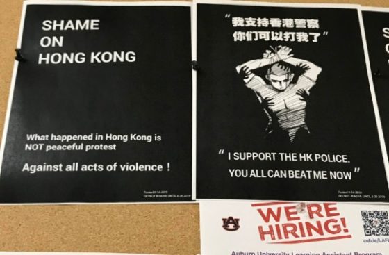 Fliers shaming the Hong Kong protesters were hung at Auburn University, according to Reddit users who reported seeing them in various parts of campus.