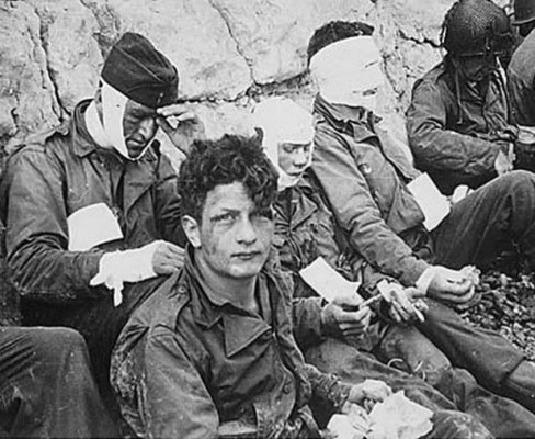 IMAGE: Soldiers of the 16th Infantry Regiment, wounded while storming Omaha Beach, wait by the chalk cliffs for evacuation to a field hospital for treatment, D-Day, June 6, 1944. Courtesy U.S. Army