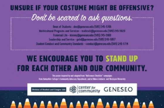 If you’re a student at State University of New York at Geneseo, all you’d have to do is email or call the no less than FIVE campus officials whose phone numbers and email addresses have been hung around campus on posters titled “Halloween checklist: Is Your Costume Offensive? Check yourself and check your friends.”