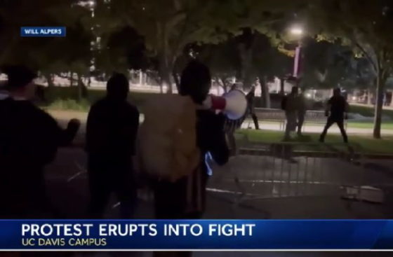 “Some in the crowd used barricades to beat on the glass of the UC Davis Conference Center, where about 30 people were inside waiting for the event to begin. … The students who organized the event agreed to cancel the remarks out of concern for safety. Staff from Student Affairs on-site agreed that there was grave danger should the event continue,” the statement continued.