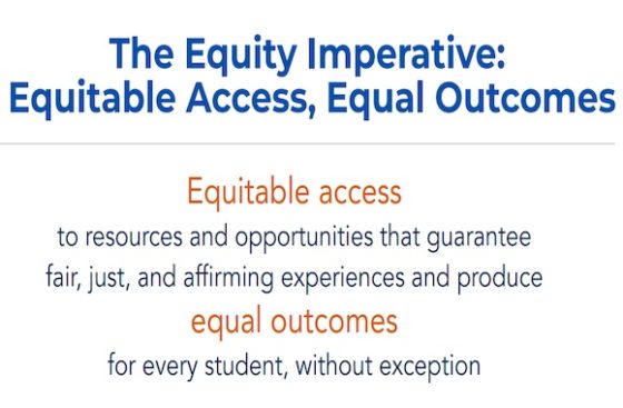 Then there’s that “Equity Imperative” which is “equitable access to resources and opportunities that guarantee fair, just, and affirming experiences and produce equal outcomes for every student, without exception” (emphasis added).