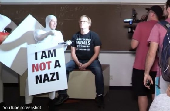As a last resort, according to Crowder, he dressed up in a bright-white spandex skin suit and wore a large A-frame sign saying “I am not a Nazi” and descended on Hermes’ classroom to confront him on Friday.