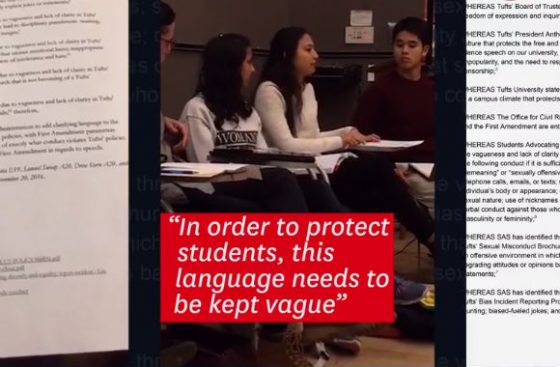 The group started investigating Tufts after its student government rejected a student-authored resolution that would have asked the school to reconcile its free-speech promises with the content of several policies, including the bias policy, which punishes students for “derogatory language” and “negative images”: