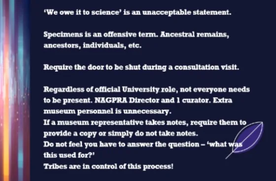 Other slides from the Indiana University NAGPRA training back up Pelton and Weiss’ comments. For example, a “Consultation 101” slideshow about working with tribal leaders states that “Tribes are in control of this process!”