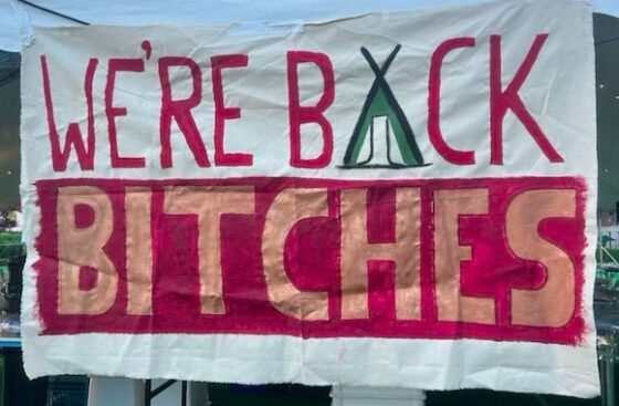 Approximately 25 anti-Israel activists crashed Columbia’s alumni reunion event on the South Lawn early Friday evening, putting up tents and hanging banners one of which read “We’re Back Bitches.”
