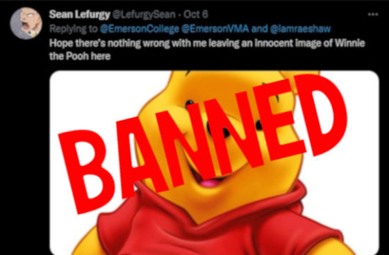 Wow. Emerson College—which is investigating a student group for stickers critical of China’s government—is hiding tweet replies that mention China. *Including ones that only show Winnie the Pooh, which is censored in China because people mockingly compare him to Xi Jinping.* https://t.co/PhwjFwnOHo pic.twitter.com/q0A6dgUF2s