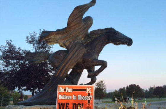 The “Galloping Ghost” statue, which features a ghost covered in a sheet riding a horse, was erected at Kaukauna High School in 2000.